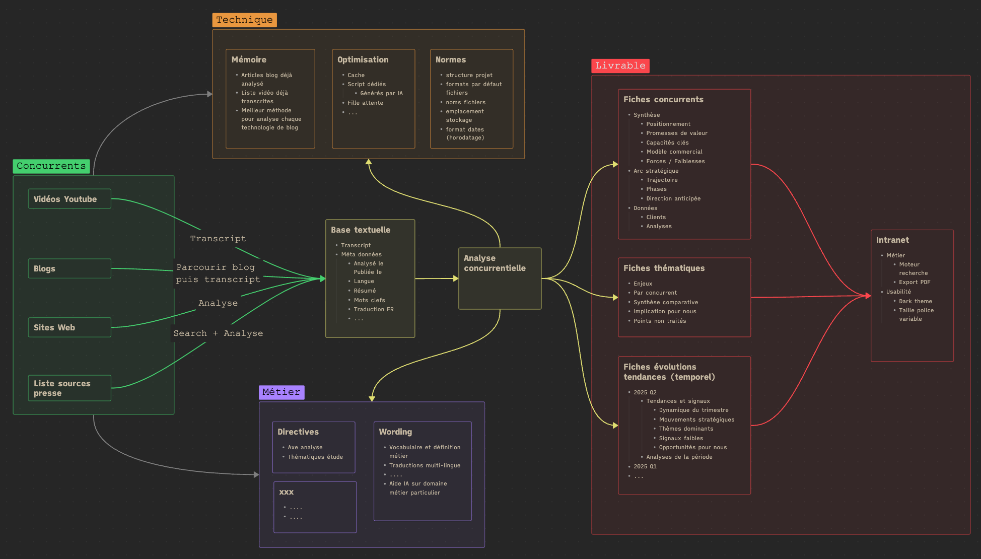 Faire ça proprement à la main, c'est l'enfer. Il faut regarder des vidéos, lire des articles, suivre des newsletters, surveiller des pages de sites, récupérer des contenus dans plusieurs langues, traduire, classer, historiser, recroiser, synthétiser. Très honnêtement, je n'arrivais pas à adresser le sujet comme je le voulais, non pas par manque de conviction, mais parce que toute la partie recueil, compilation et structuration de l'information était trop chronophage.